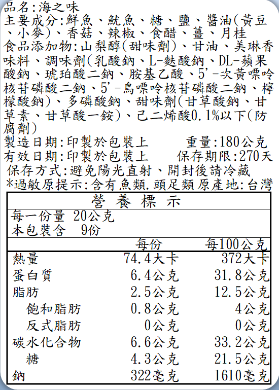 | 成分 | 鮮魚、魷魚、糖、鹽、醬油(黃豆、小麥)、香菇、辣椒、食醋、薑、月桂 食品添加物:山梨醇(甜味劑)、甘油、美琳香味料、調味劑(乳酸鈉、L-麩酸鈉、DL-蘋果酸鈉丶琥珀酸二鈉、胺基乙酸、5’-次黃嘌呤核苷磷酸二鈉、5’-鳥嘌呤核苷磷酸二鈉丶檸檬酸鈉)丶多磷酸鈉、甜味劑(甘草酸鈉、甘草素、甘草酸一銨)、己二烯酸0.1%以下(防腐劑) |