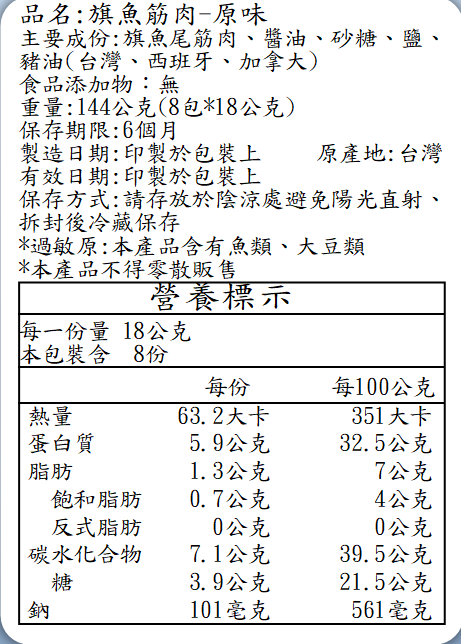 旗魚肉筋|產品內容物與規格說明| 成分 | 旗魚尾筋肉、醬油、砂糖、鹽、棕梠油、洋蔥、辣椒、海藻糖 |